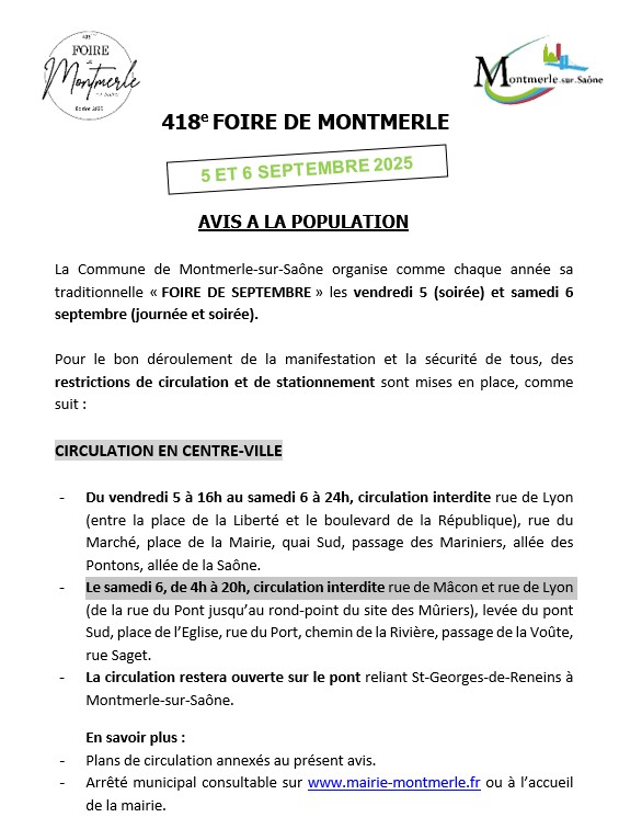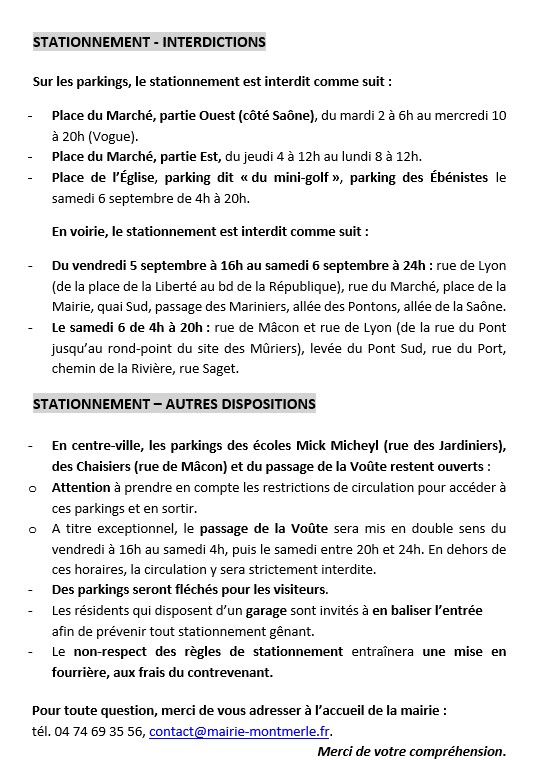 Circulation et stationnement Toutes les informations sur le site de la mairie. Accueil – Montmerle-sur-SaônePour toute question, merci de vous adresser à l’accueil de la mairie : tél. 04 74 69 35 56, contact@mairie-montmerle.fr. Plan de circulation pour les soirées des vendredi 5 et samedi 6 septembre Plan de circulation samedi 6 septembre journée